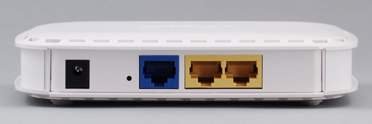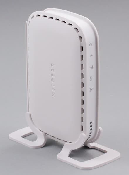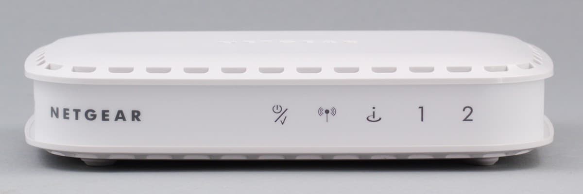 Так что на задней панели можно увидеть только два порта LAN, один WAN, кнопку сброса и вход для блока питания. Рассматриваемая модель, как и многие другие от Netgear, использует встроенные беспроводные антенны, так что разъемов для внешних здесь мы не увидим. На передней панели находятся пять индикаторов — статус, беспроводная связь, Интернет, LAN1 и LAN2.