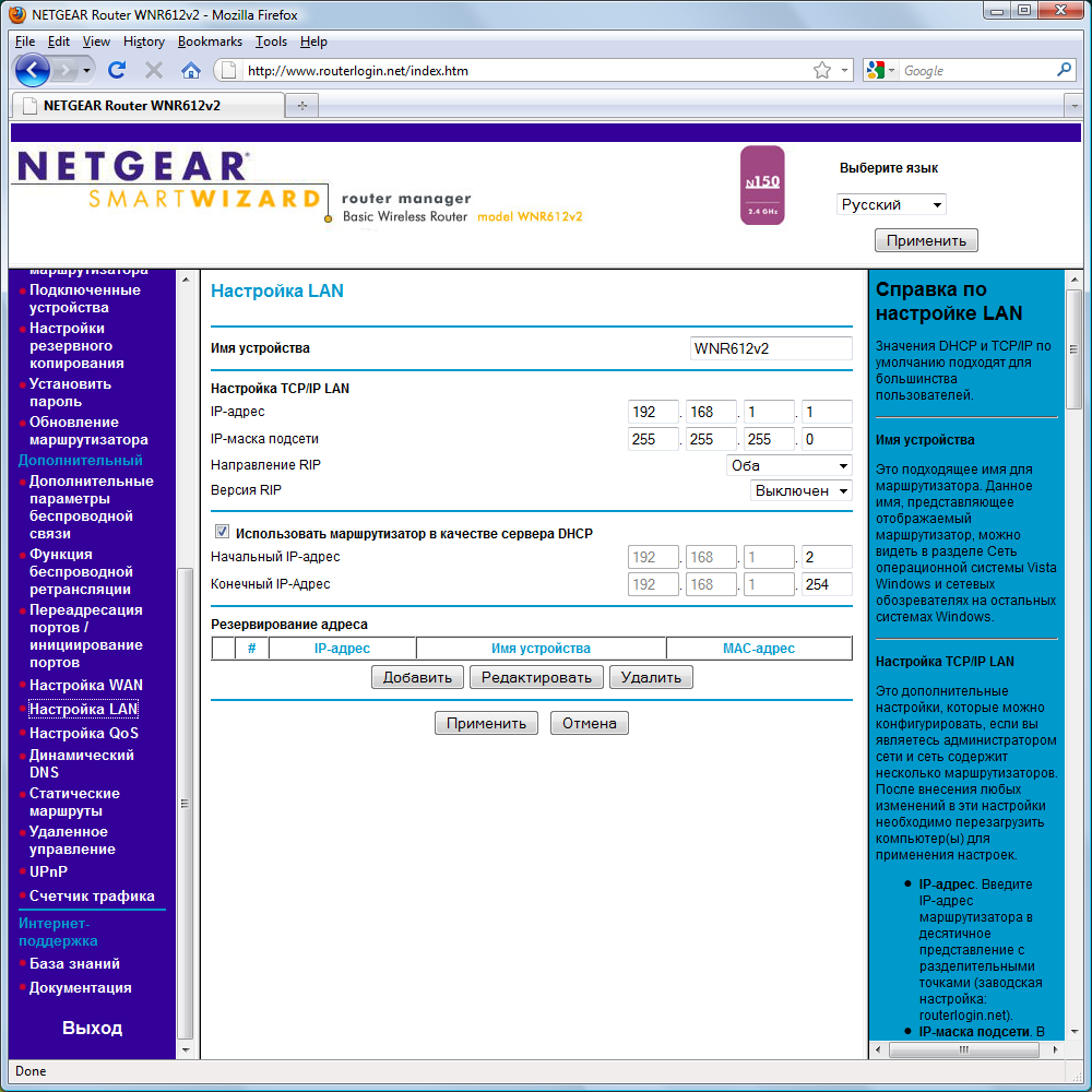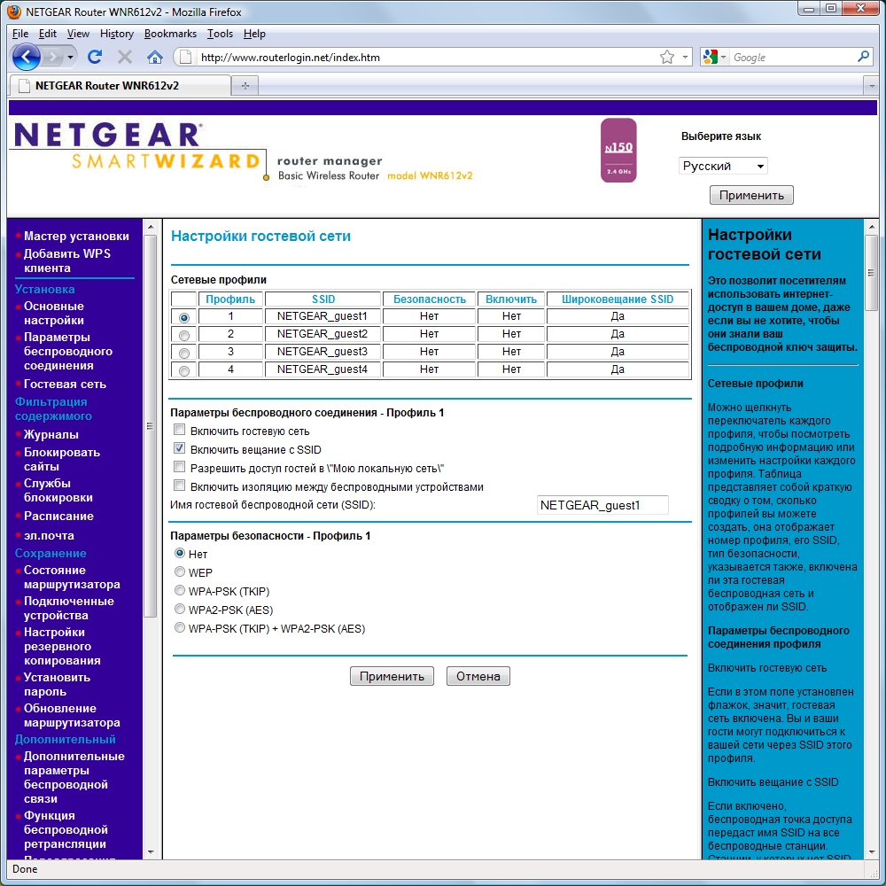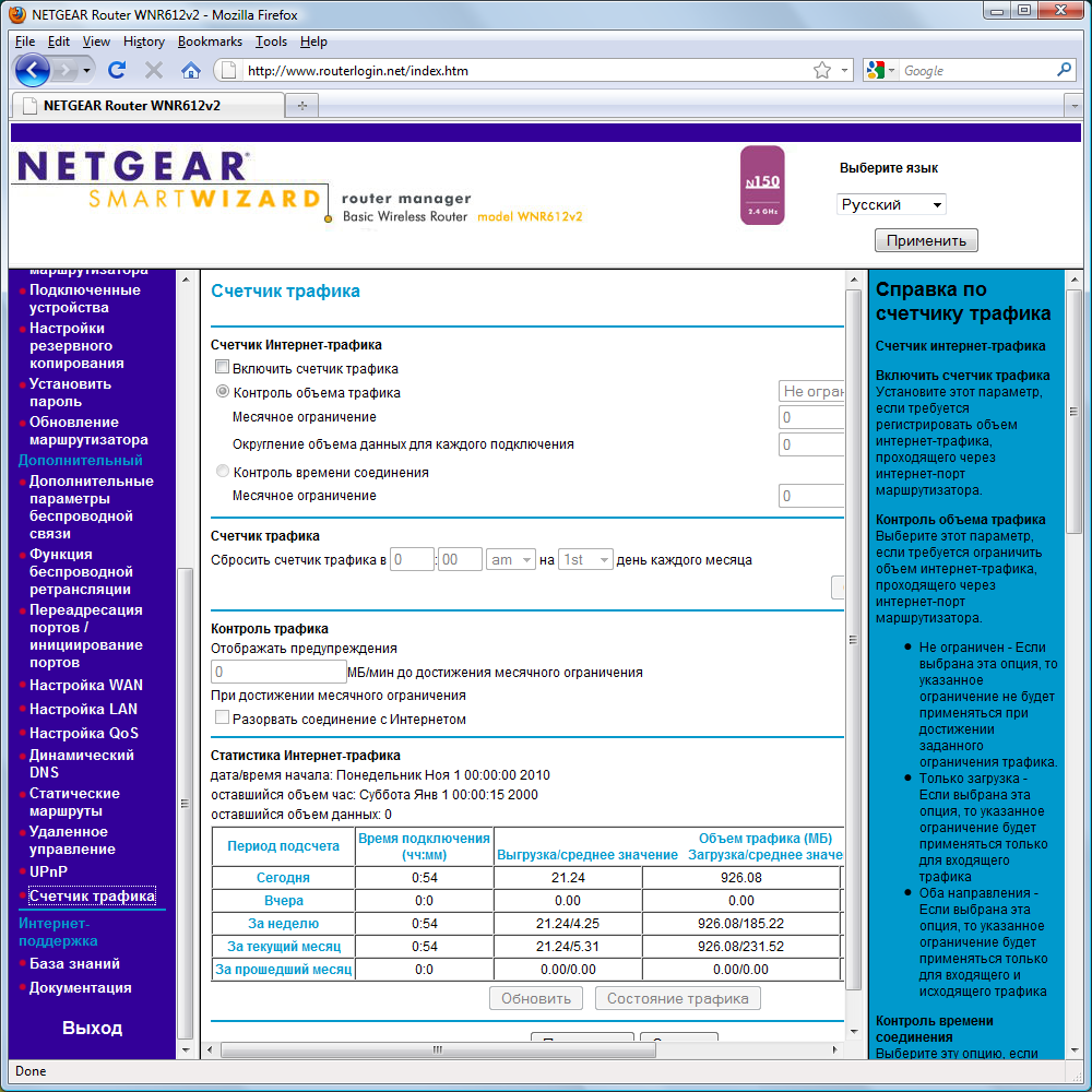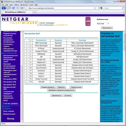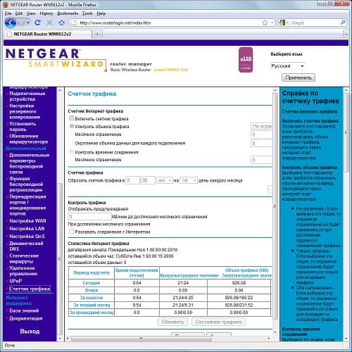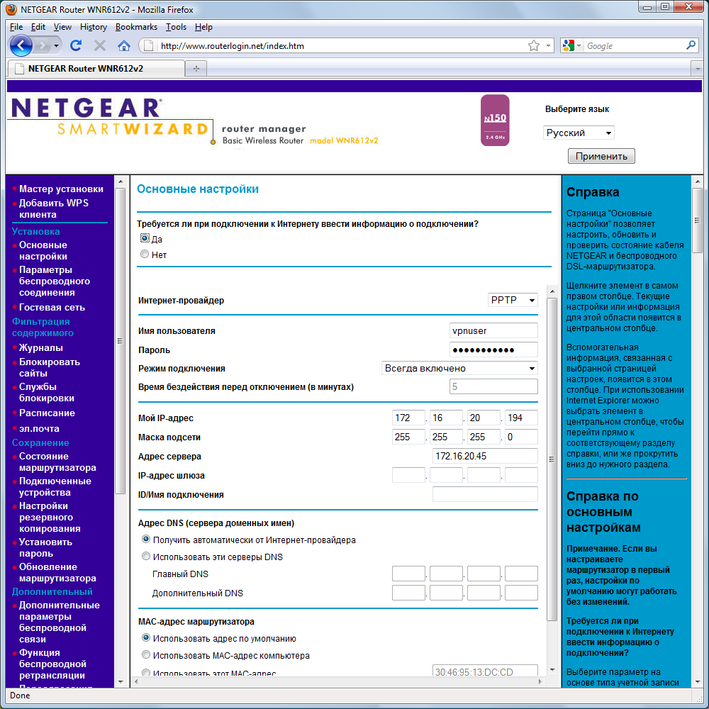Никакого специализированного программного обеспечения для настройки или работы с устройством нет. Все операции осуществляются исключительно через web-брузер. Для доступа к web-интерфейсу необходимо на подключенном клиенте открыть страницу www.routerlogin.net. Далее будет предложено выбрать вариант настройки — с использованием помощника или для опытных пользователей. В первом случае роутер пытается самостоятельно обнаружить тип подключения (для прямого подключения может сработать, а вот локального провайдера роутер может и не опознать), настроить его, а потом указать параметры беспроводного подключения. Если же выбрать второй вариант — то вы сразу попадаете в привычный «полный» интерфейс устройства. Честно говоря, он нас немного удивил — не ждали таких возможностей от подобного недорогого устройства. Также надо отметить и то, что страницы локализованы и есть неплохо переведенная встроенная справочная система. Но обо всем по порядку. Тестирование проходило с прошивкой бета-версии V1.0.0.1_1.0.5.