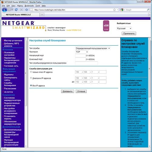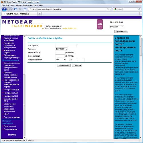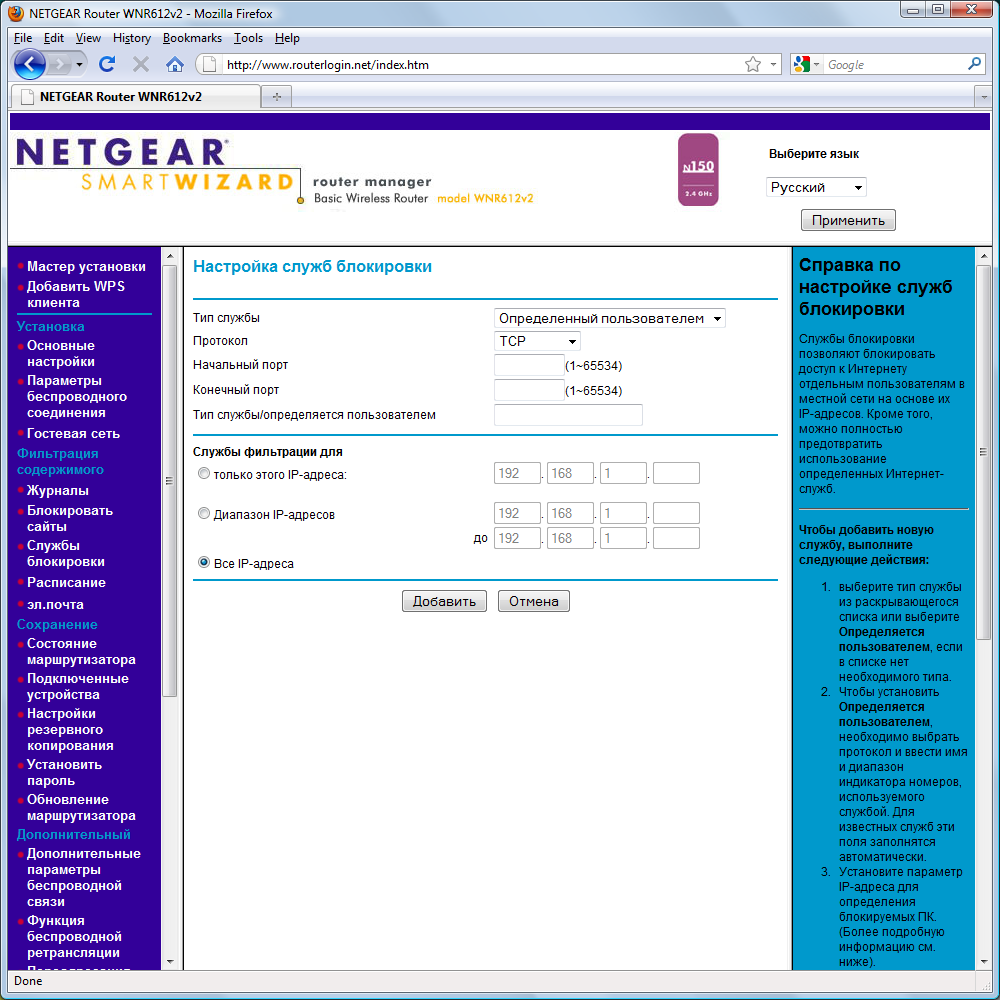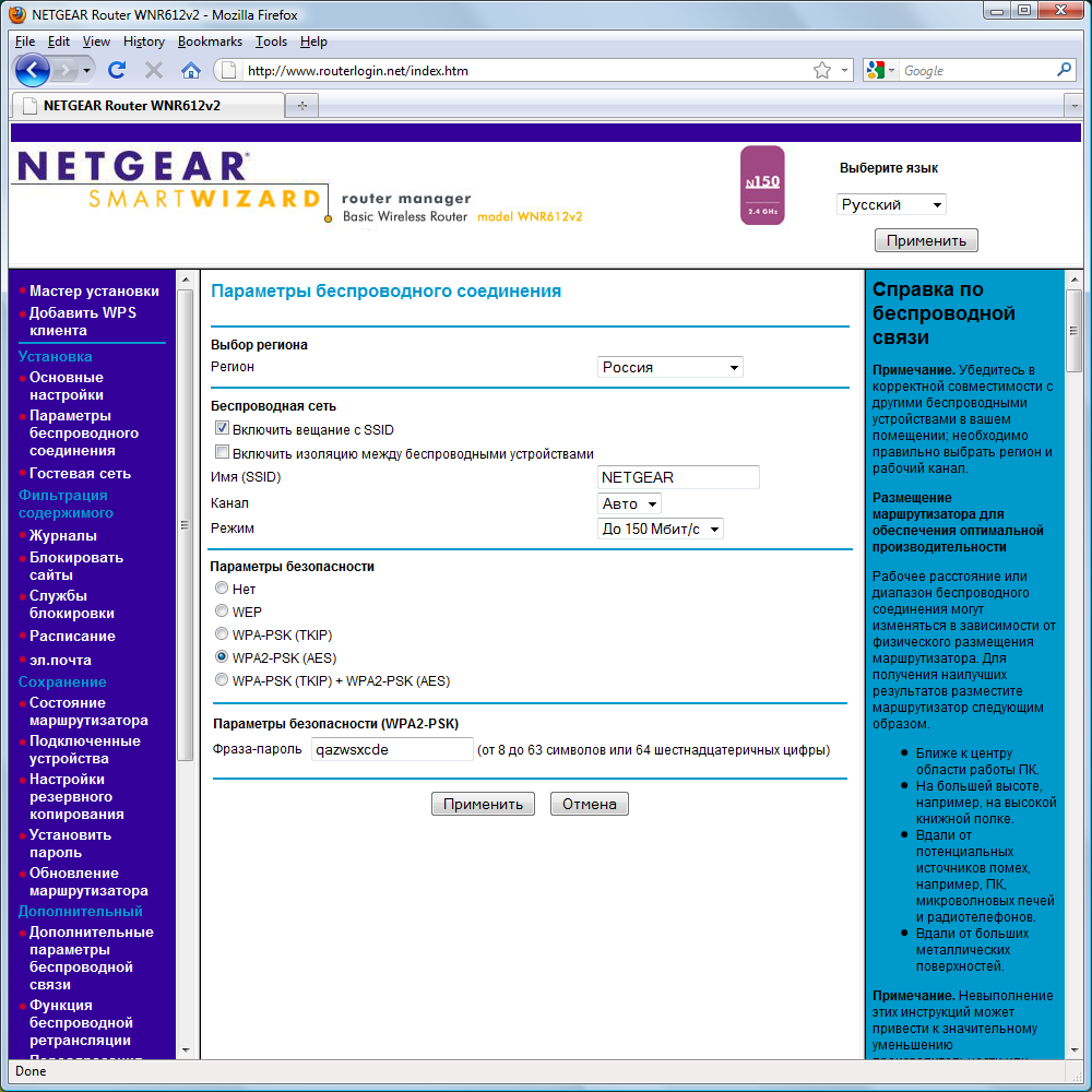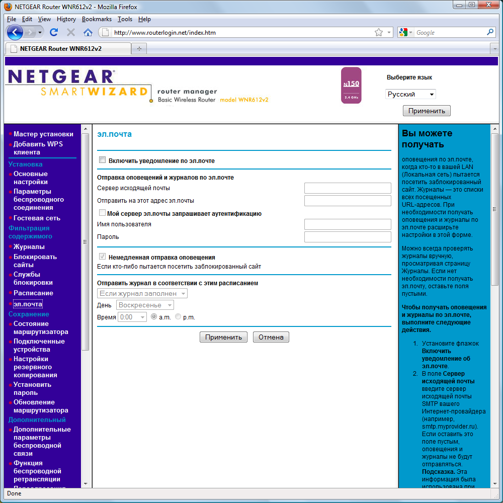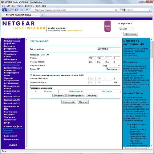 Никакого специализированного программного обеспечения для настройки или работы с устройством нет. Все операции осуществляются исключительно через web-брузер. Для доступа к web-интерфейсу необходимо на подключенном клиенте открыть страницу www.routerlogin.net. Далее будет предложено выбрать вариант настройки — с использованием помощника или для опытных пользователей. В первом случае роутер пытается самостоятельно обнаружить тип подключения (для прямого подключения может сработать, а вот локального провайдера роутер может и не опознать), настроить его, а потом указать параметры беспроводного подключения. Если же выбрать второй вариант — то вы сразу попадаете в привычный «полный» интерфейс устройства. Честно говоря, он нас немного удивил — не ждали таких возможностей от подобного недорогого устройства. Также надо отметить и то, что страницы локализованы и есть неплохо переведенная встроенная справочная система. Но обо всем по порядку. Тестирование проходило с прошивкой бета-версии V1.0.0.1_1.0.5.