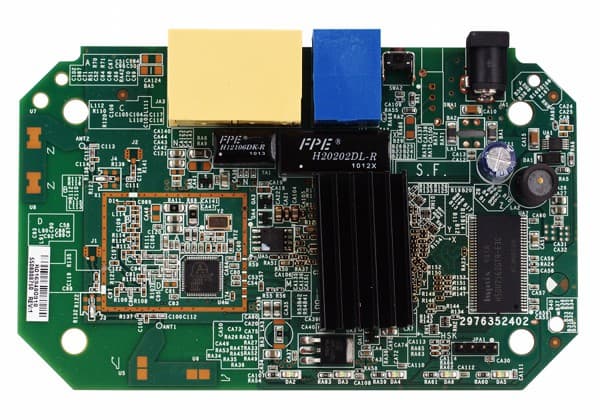 Аппаратная платформа рассматриваемой модели основана на базе чипов Atheros — процессоре AR7240 (MIPS, 400 МГц) и радиоблоке AR9285. Последний работает на частоте 2,4 ГГц, поддерживает стандарты 802.11b/g/n с максимальной производительностью до 150 Мбит/с. Антенны у него две, но режим MIMO только 1×1, а вот на двух каналах он работать умеет. Интересно, что соединение данных микросхем осуществляется через стандартный интерфейс PCI Express, а использованный процессор очень универсальный, в частности в нем реализованы сетевые порты (на самом деле он поддерживает до четырех LAN и даже USB 1.1). Дополняют картину один чип оперативной памяти на 32 МБ и флеш на 4 МБ. На плате можно обнаружить консольный порт.
