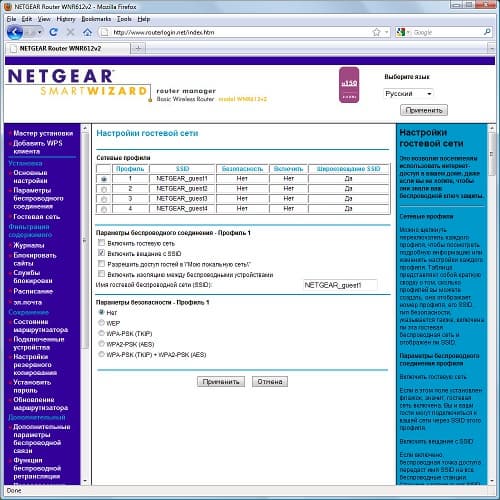 Беспроводной интерфейс имеет три страницы с параметрами. На первой вы задаете имя сети, режим безопасности и ключ, максимальную скорость и канал. Роутер поддерживает открытые сети, WEP, WPA-PSK и WPA2-PSK. Можно запретить общение беспроводных клиентов между собой. Вторая страница — организация гостевой сети. Предусмотрено программирование и выбор четырех профилей с собственными именами сетей и параметрами безопасности. По умолчанию «гости» могут только пользоваться интернетом, но при необходимости можно разрешить им работать друг с другом и с локальной сетью пользователя.