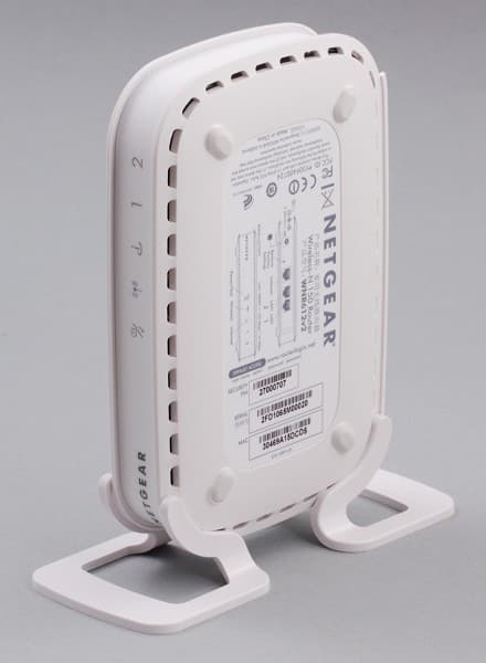 Вентиляция у роутера пассивная — по краям верхней и нижней крышек находятся отверстия. Во время работы он греется не сильно, так что этого вполне достаточно. Устойчивости WNR612 придают четыре резиновые ножки. При необходимости устройство можно поставить вертикально, а вот крепления на стену не предусмотрено. На нижней поверхности роутера есть наклейка с описанием подключений, данными доступа к настройкам и другой полезной информацией.