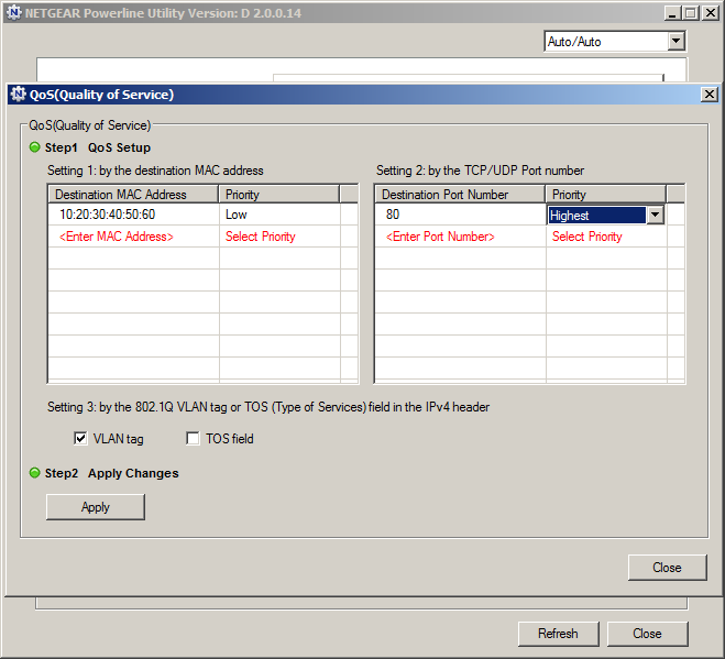 Утилита показывает все доступные в сети адаптеры и позволяет их настроить: поменять имя адаптера, установить ключ шифрования, сбросить настройки, отключить светодиоды, выбрать параметры QoS. В последнем случае речь идет об установке приоритетов трафику по MAC-адресу или номеру порта протокола TCP/IP. Из соображений безопасности, для изменения ключа шифрования удаленного устройства, то есть доступного программе только через сегмент сети по электропроводке, нужно знать его индивидуальный пароль, который указан на корпусе адаптера.