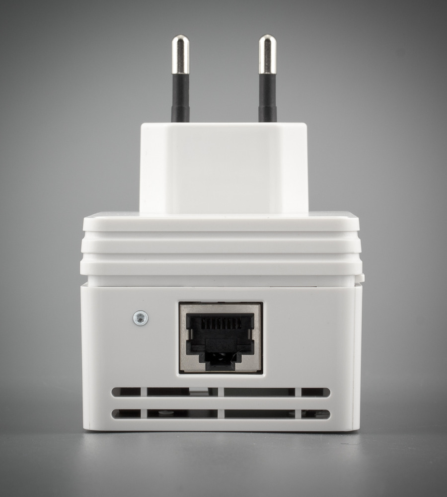 Корпус изготовлен из белого глянцевого пластика. По всему контуру размещены решетки пассивной вентиляции. На лицевой стороне расположены три светодиода — питание, подключение и активность сети Ethernet, статус сегмента Powerline. По цвету последнего можно быстро определить качество связи. На одной из боковых сторон находится кнопка для быстрой синхронизации ключа шифрования, а с другой стороны — скрытая кнопка сброса.