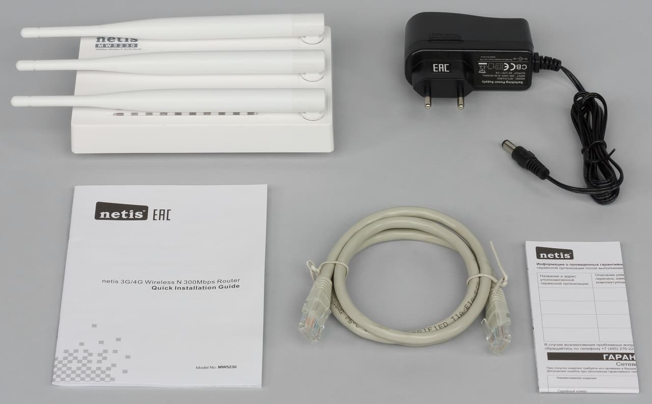 Комплект поставки базовый и не отличается от других недорогих моделей: роутер, блок питания (12 В 1 А), сетевой патч-корд, краткое руководство по подключению и настройке на нескольких языках (русский присутствует), а также гарантийный талон.