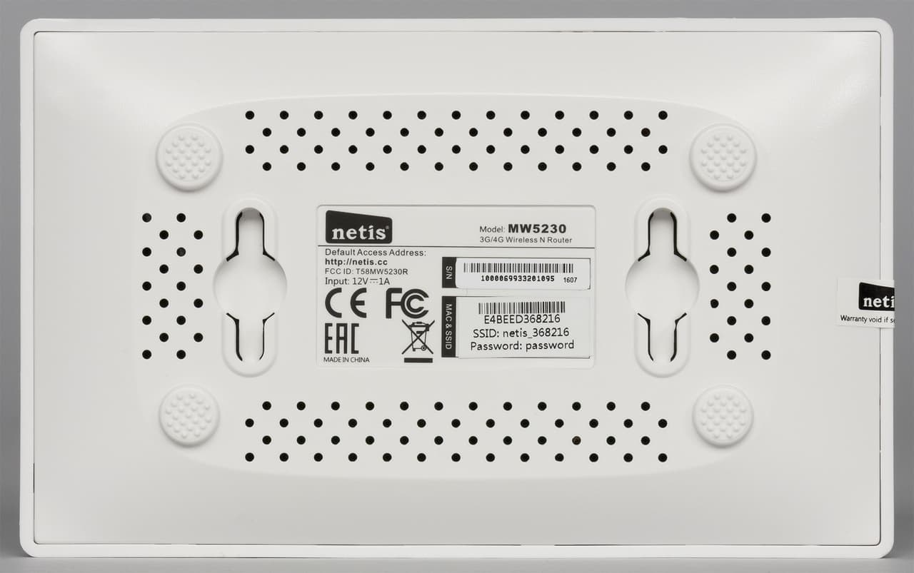 На дне мы видим отверстия пассивной вентиляции, не очень удобные пластиковые ножки и элементы для крепления на стену. Здесь же расположена традиционная информационная наклейка с серийным номером, MAC-адресом порта WAN, требованиями к блоку питания, данными для входа в веб-интерфейс роутера и подключения к Wi-Fi.