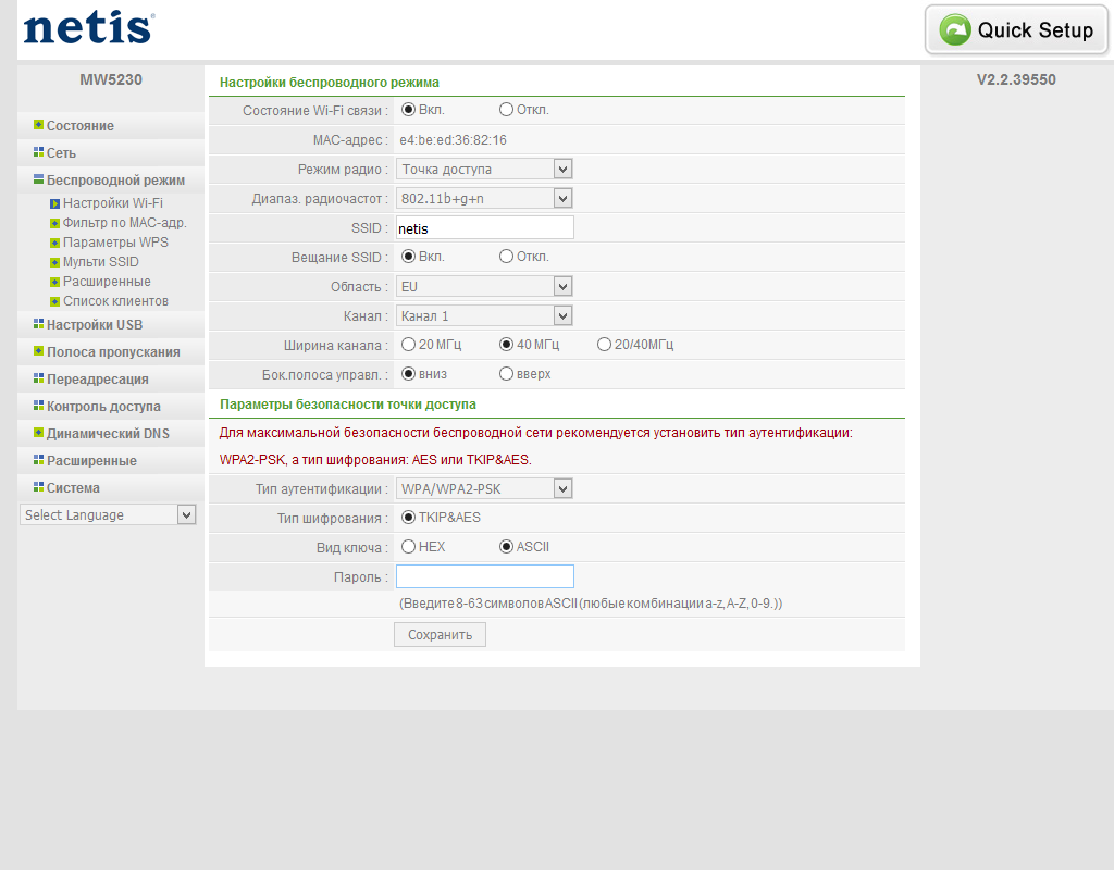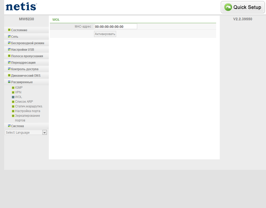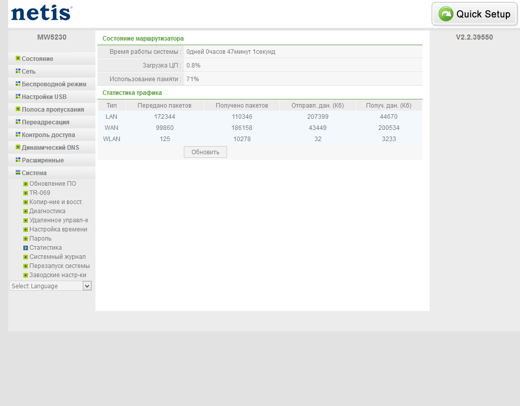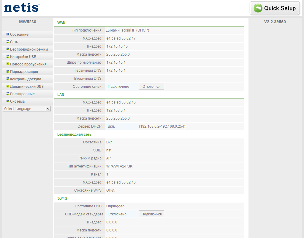 Для настройки используется традиционный веб-интерфейс. Для него предусмотрено несколько вариантов переводов, в том числе и на русский язык. Предусмотрен доступ через WAN, причем номер порта можно изменить. Протокол HTTPS устройство не поддерживает. Отметим наличие упрощенного «одностраничного» варианта настройки интернет-подключения и Wi-Fi. По умолчанию устройство создает защищенную беспроводную сеть, однако пароль стандартный.