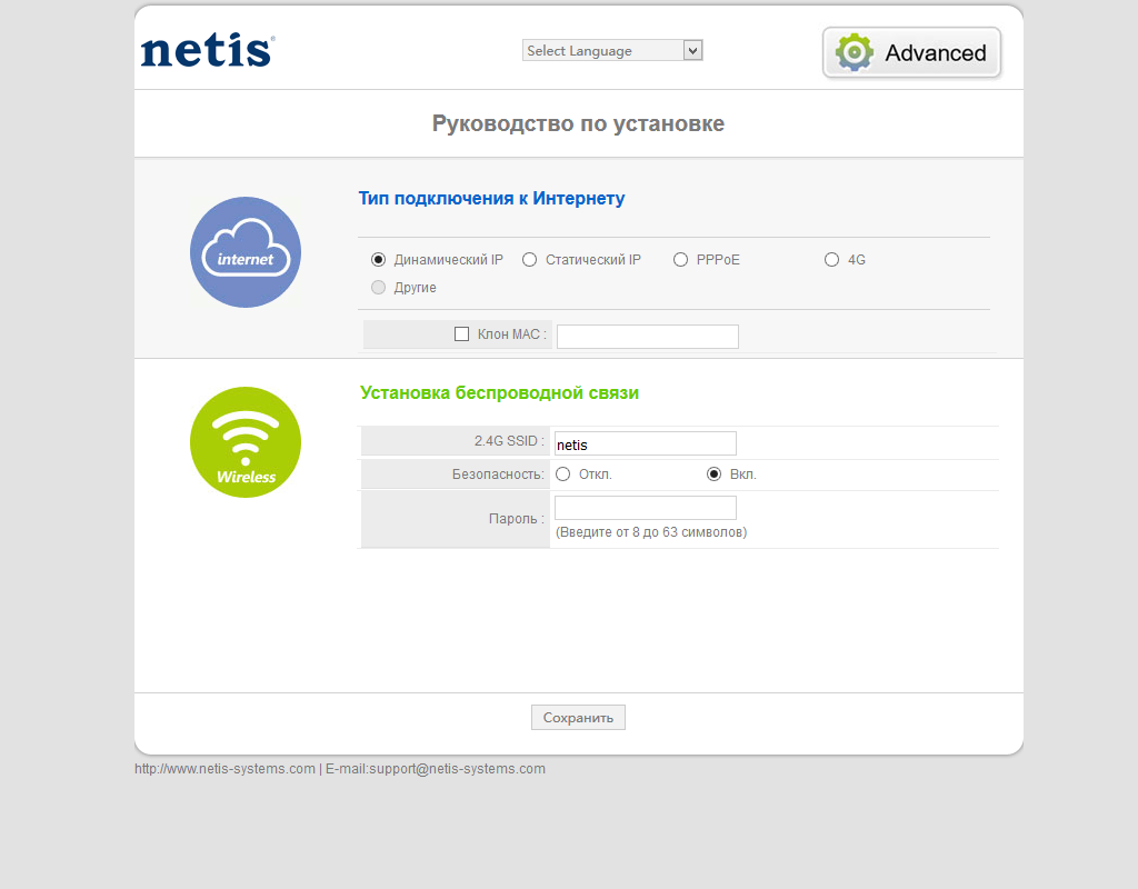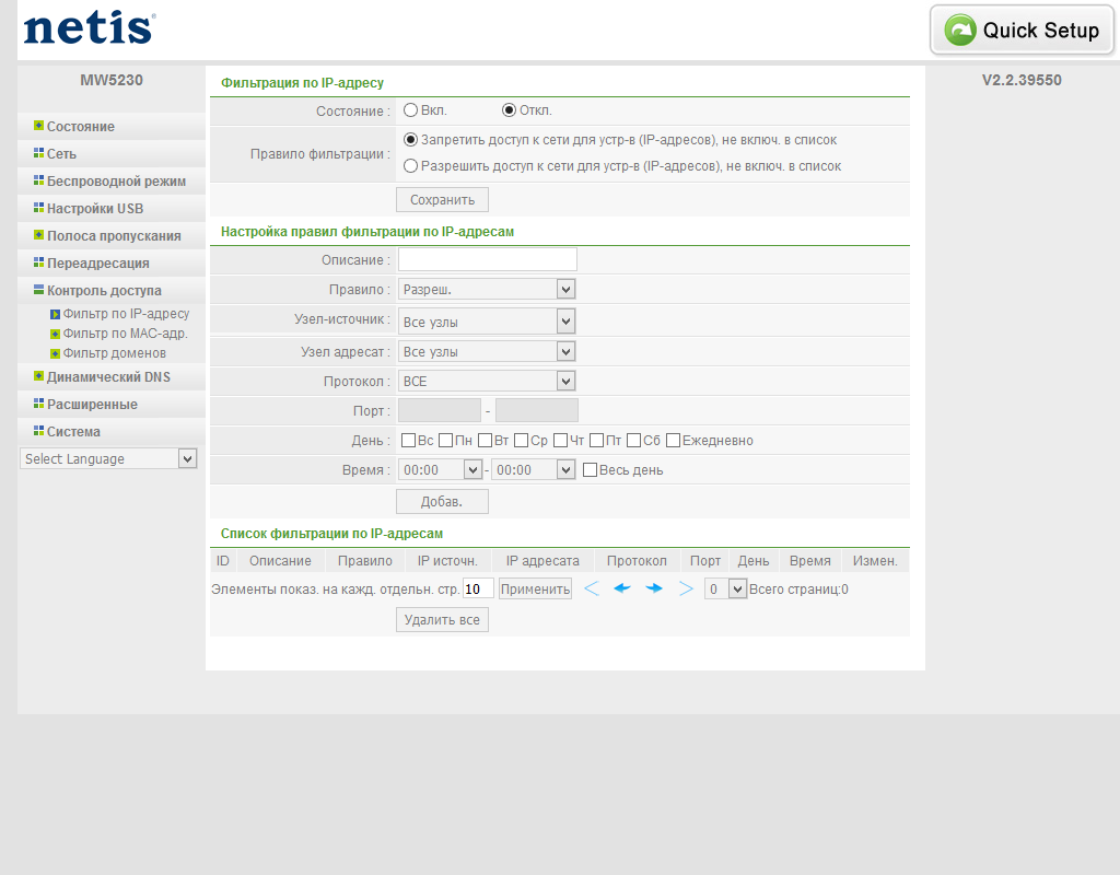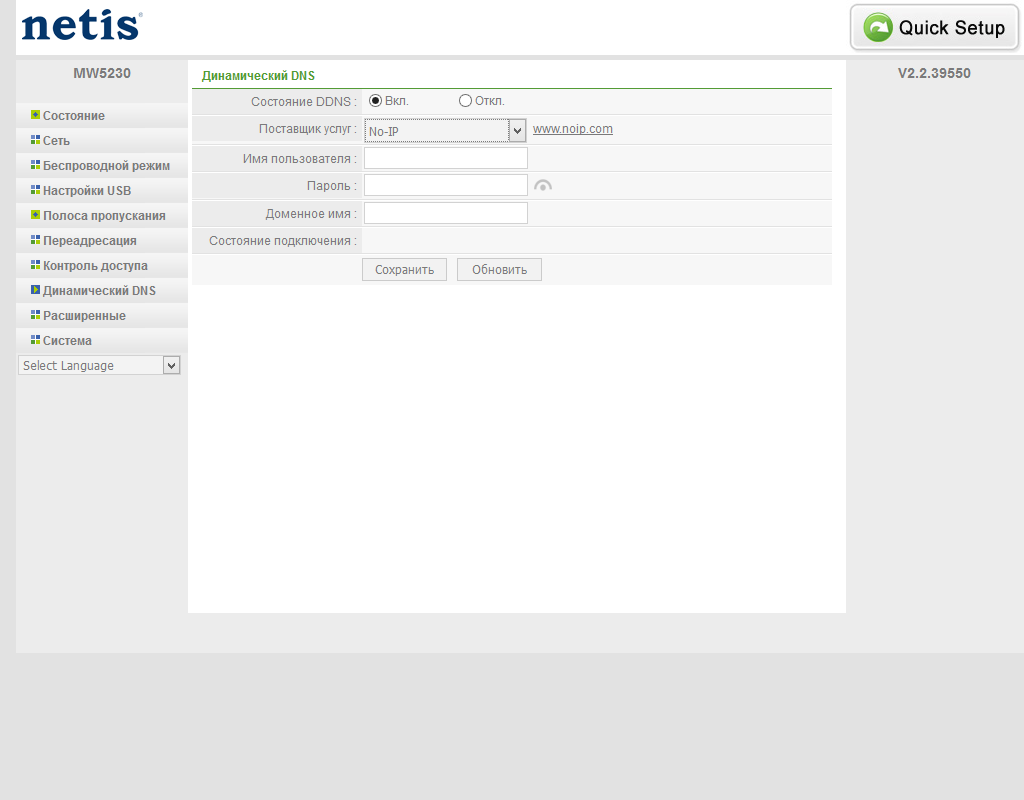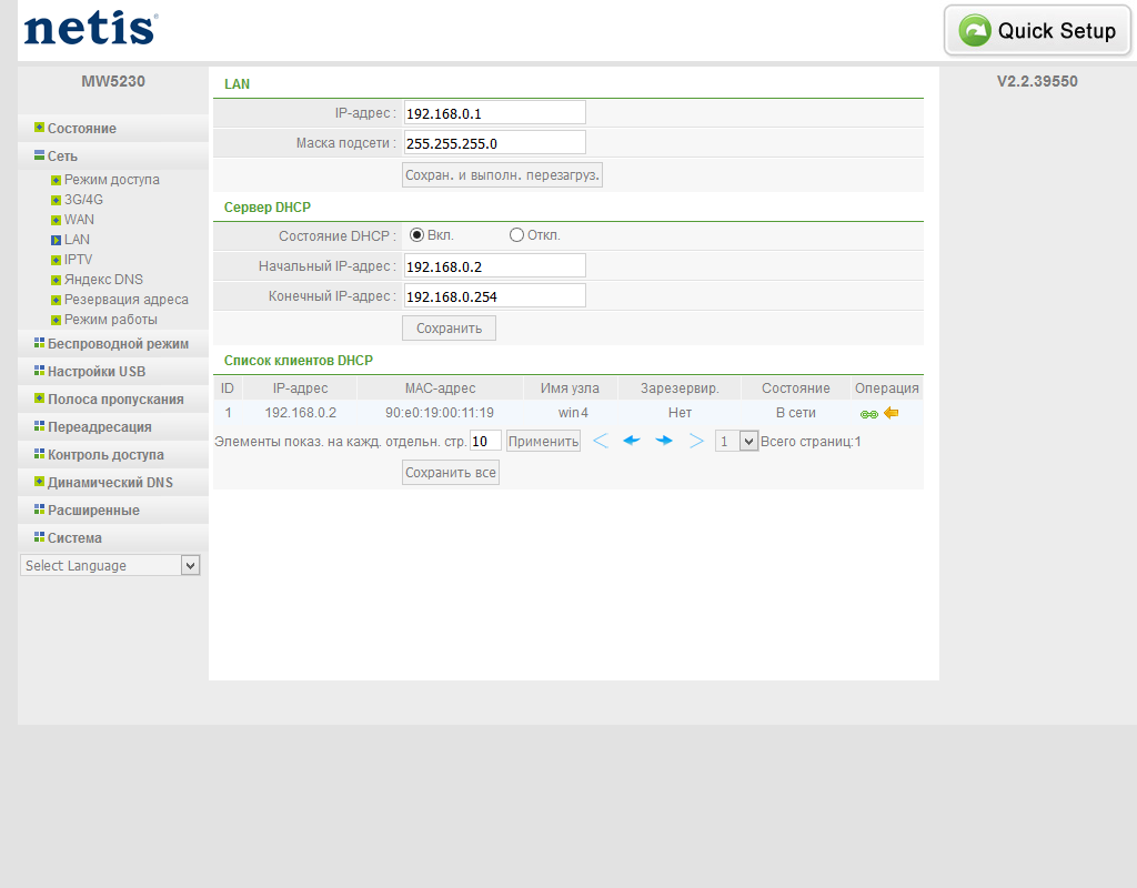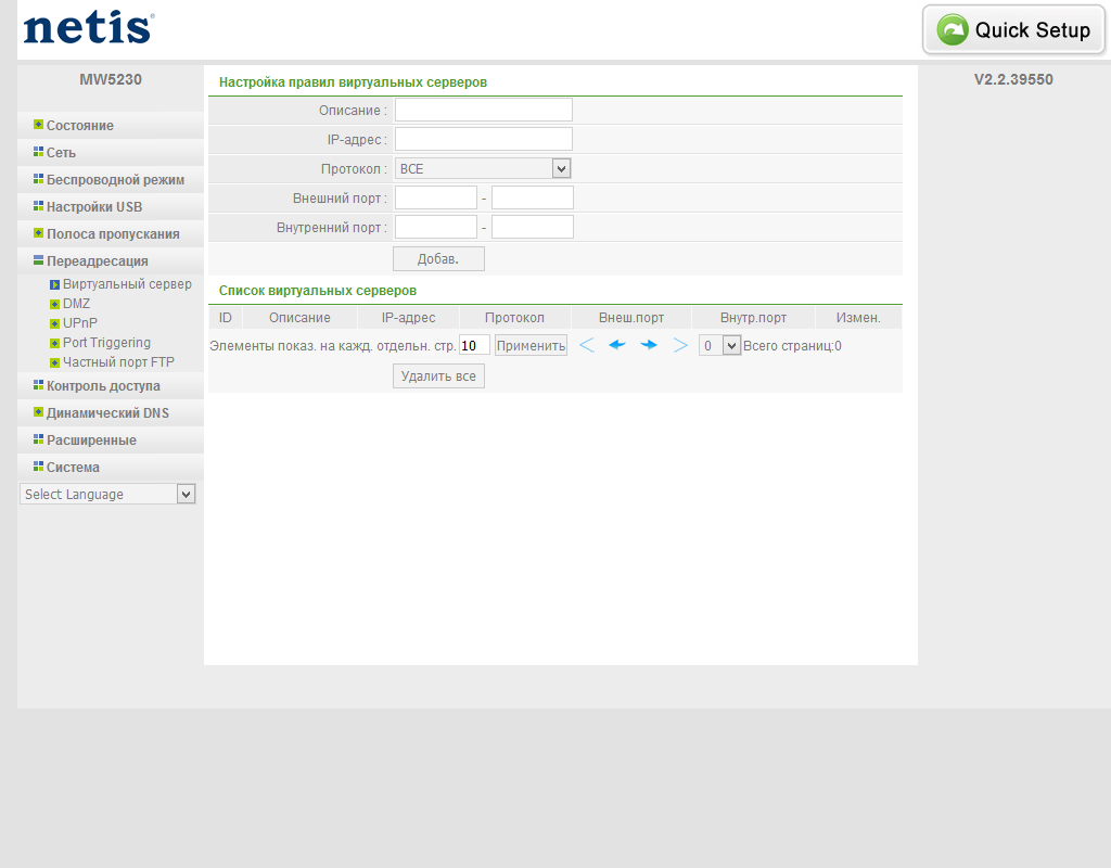 Для настройки используется традиционный веб-интерфейс. Для него предусмотрено несколько вариантов переводов, в том числе и на русский язык. Предусмотрен доступ через WAN, причем номер порта можно изменить. Протокол HTTPS устройство не поддерживает. Отметим наличие упрощенного «одностраничного» варианта настройки интернет-подключения и Wi-Fi. По умолчанию устройство создает защищенную беспроводную сеть, однако пароль стандартный.