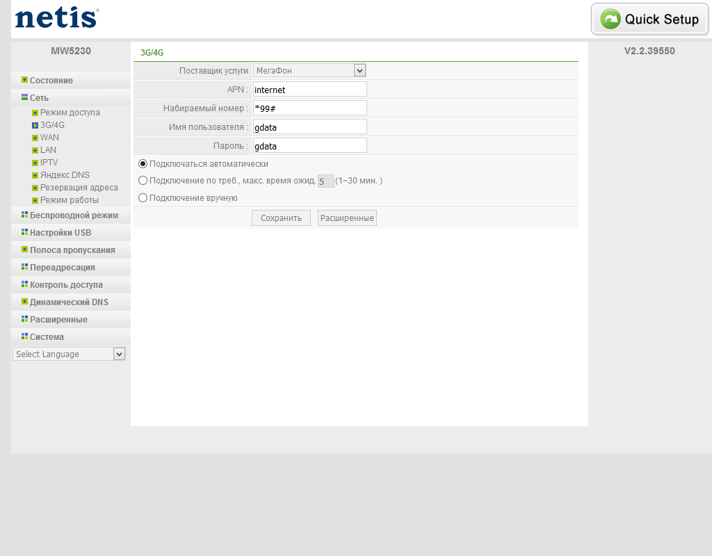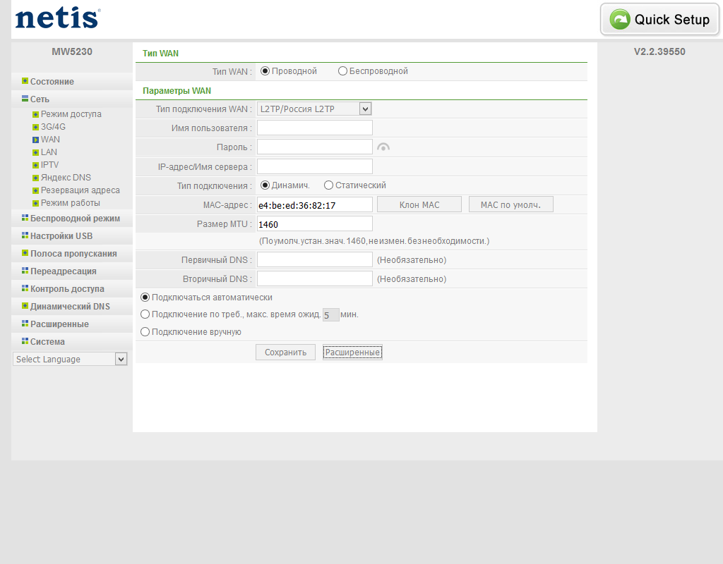 Для подключения через кабель поддерживаются соединения IPoE, PPPoE, PPTP и L2TP. Набор опций стандартный и включает в себя замену MAC, выбор IP-адреса и установку MTU. Настройка сотового модема заключается в выборе оператора и параметров APN. Причем в готовом списке уже записаны профили для четырех отечественных провайдеров.