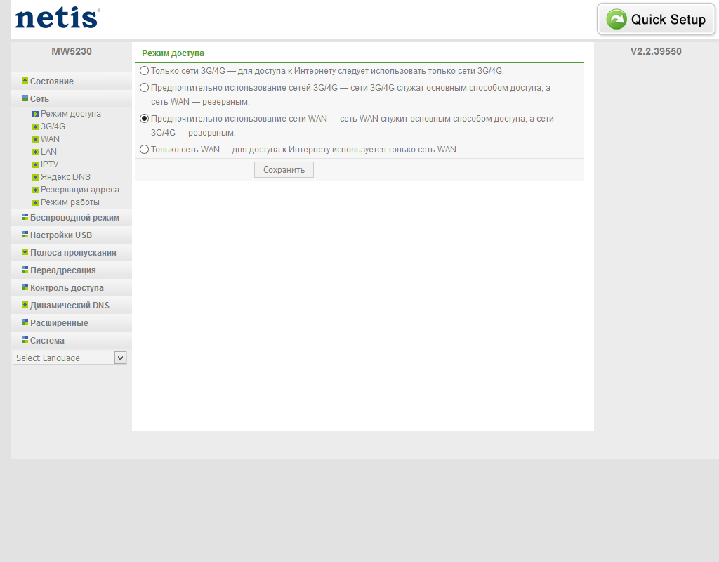 Поскольку модель поддерживает модемы для сотовых сетей, то здесь можно выбрать один из режимов подключения к интернету — только по одному интерфейсу или по двум с резервированием. Причем в данной модели WAN может работать как по проводу, так и быть клиентом для другой беспроводной точки доступа или роутера.