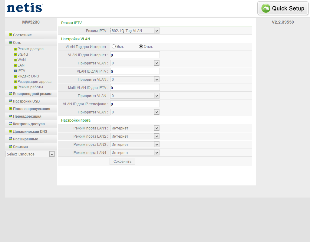 Роутер поддерживает сервисы IPTV в нескольких конфигурациях — мостовое соединение с одним или двумя портами LAN, VLAN с выделенными тегами для телевидения и телефонии с трансляцией потоков на выбранные порты LAN. Реализована и возможность работы с мультикаст-трафиком (IGMP Proxy, IGMP Snooping). Сервиса udpxy в устройстве нет.