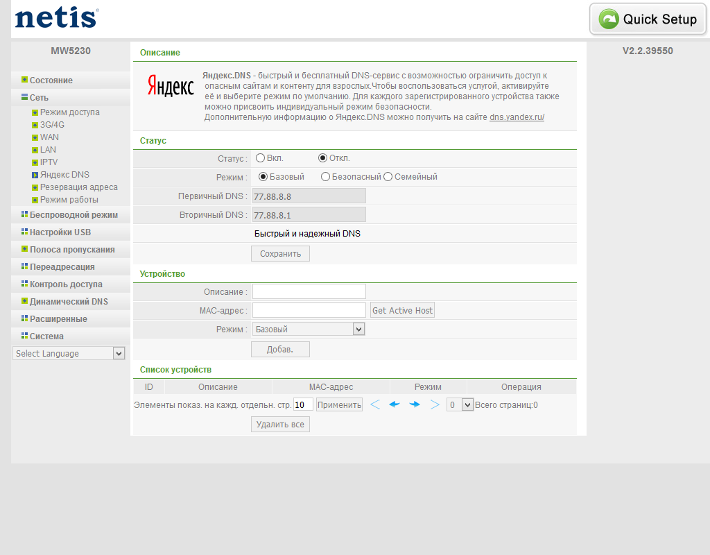 Для дополнительной защиты клиентов локальной сети, можно активировать сервис Яндекс.DNS. Причем есть возможность выбора одного из трех профилей (Базовый, Безопасный, Семейный) для каждого устройства индивидуально.