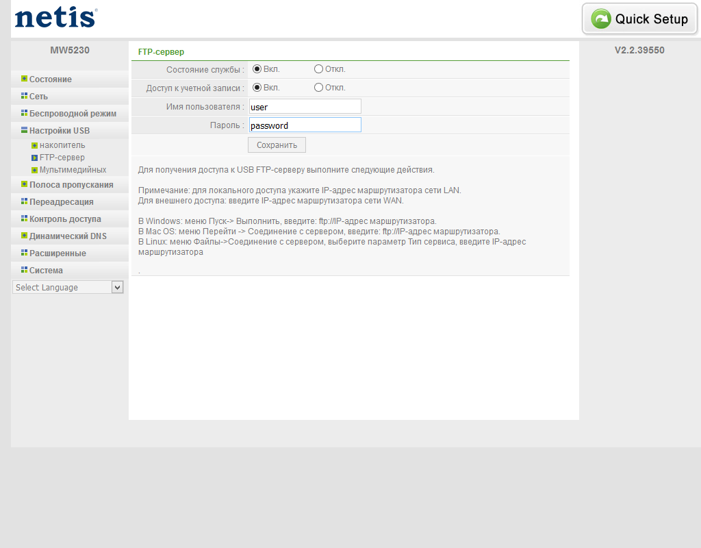 На дисках может быть несколько разделов. Поддерживаются файловые системы NTFS, FAT32, ext2/3/4 и exFAT. Доступ к данным осуществляется по протоколам SMB/CIFS и FTP. Явной недоработкой является открытость сервисов с настройками по умолчанию и через интернет (со стороны WAN). Как минимум стоит включить доступ с аккаунтом пользователя, который может быть только один для каждого сервиса.