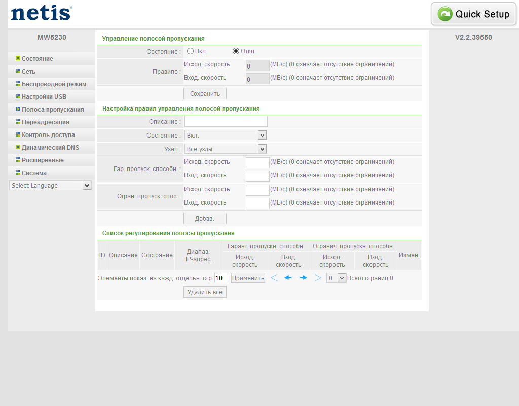В роутере предусмотрена функция управления полосой пропускания. В указываемых пользователем правилах могут участвовать как отдельные клиенты, так и диапазоны и подсети. В каждом правиле устанавливаются гарантированная и максимальная скорость для приема и передачи данных. Сервис создает очень высокую нагрузку на процессор роутера, так что пользоваться им стоит осторожно.