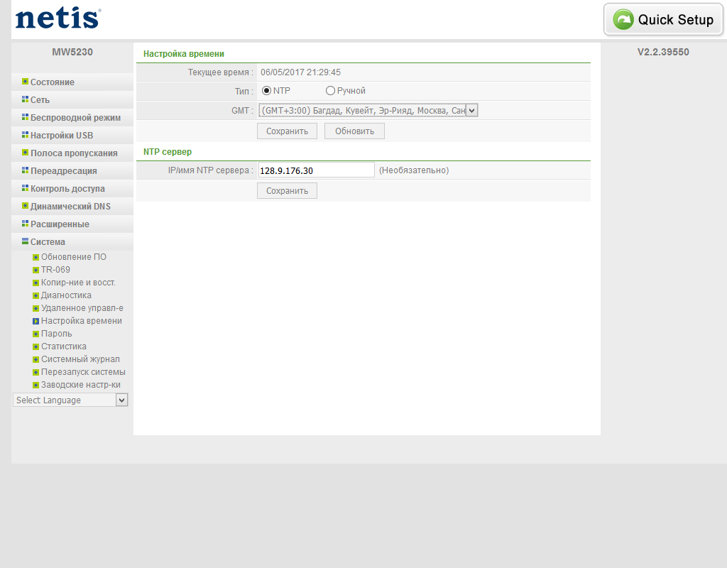 Раздел «Система» традиционно включает в себя изменение пароля администратора, обновление прошивки из файла, сохранение/восстановление/сброс конфигурации, настройку встроенных часов, перезагрузку.