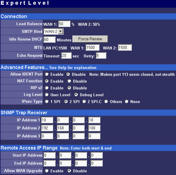 Тут можно настроить балансировку трафика между WAN-портами (об этом было рассказано выше), закрепить SMTP (email) трафик за определенным WAN-интерфесом. Последнее нужно в случае, к примеру, если провайдер, у которого находится ваш почтовый ящик, разрешает доступ к своему SMTP-серверу только с определенных маршрутов (например с линии, подсоединенной к WAN1), изменить размер MTU на WAN-интерфейсах и другие опции, о которых уже было рассказано. Кроме этого, возможно отключить функцию NAT, превратив Nexland PRO800 Turbo в бридж.