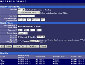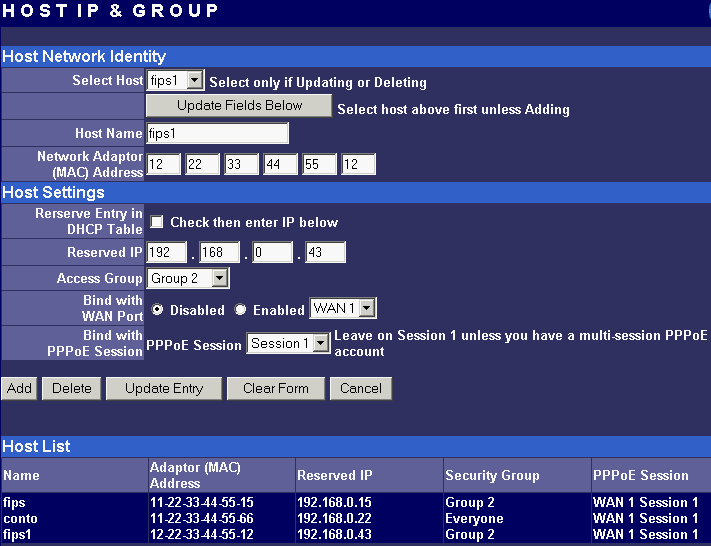 В данном разделе конфигурации можно жестко привязать IP-адрес к MAC (что позволяет несколько усилить безопасность внутри сети), в том числе, выдавать определенный IP-адрес только определенному MAC-адресу или привязать определенный IP-адрес к одному из WAN-интерфейсов. Об этом уже было рассказано выше, но в качестве примера добавлю, что таким способом можно на один из интерфейсов посадить FTP-сервер, а другой оставить для интернет-пользователей. Этим мы добьемся, что FTP-сервер не будет мешать работе пользователей. В этом же разделе конфигурации можно объединять IP-адреса группы. Группы используются для задания правил фильтрации (об этом чуть ниже). Из недостатков групп стоит отметить тот факт, что их (групп) всего 4 (плюс группа «everyone» — все). Для большой сети этого набора может оказаться недостаточно. Плюс, в группу невозможно записать диапазон IP-адресов или целую подсеть. Придется перечислять адреса по одному. Представляете, сколько времени потребуется на ввод во вторую группу 128 адресов?