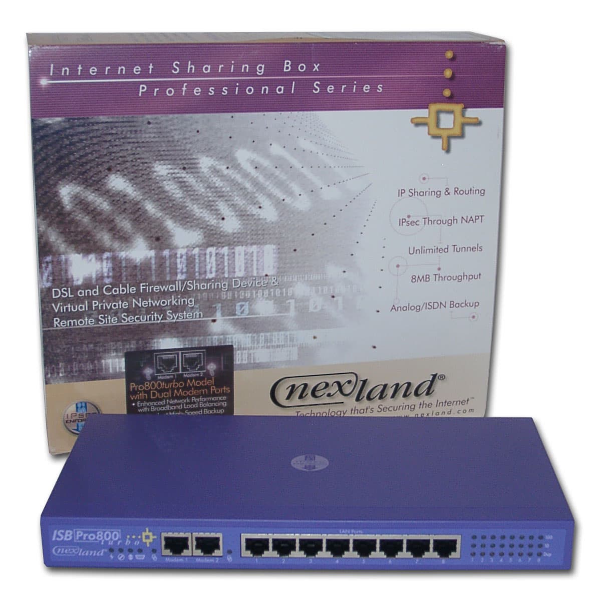 Теперь перейдем к рассмотрению одного из представителей домашних маршрутизаторов, устройству ISB PRO800 Turbo от компании Nexland. Он включает в себя много передовых идей в своем секторе, в том числе поддержку протокола IPsec, о чем сообщает своеобразный значок наверху устройства. Стоимость устройства на данный момент составляет около 400$. Это значительная сумма, так что давайте посмотрим, что мы получим за эти деньги.