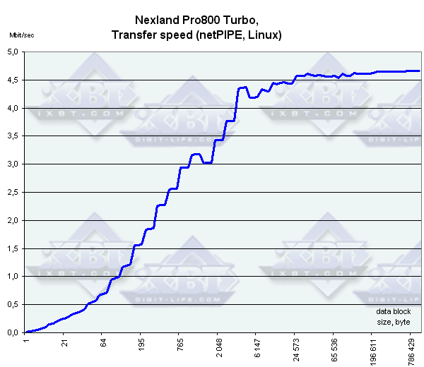 Программа генерирует трафик методом «Ping Pong». Поэтому скорость передачи данных будет одинакова вне зависимости от того, с какой стороны находится клиент netPIPE, а с какой — сервер. Максимальная пиковая скорость передачи — 4,66 Мбит/сек