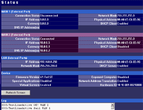 Главное меню позволяет настроить параметры WAN-интерфейсов, такие как IP-адреса интерфейсов и DNS-серверов, режим работы интерфейса (основной или резервный), активизировать PPPoE-соединение, и даже сменить MAC-адрес интерфейса (в текущей версии прошивки смена MAC-адресов не работала — после смены MAC-адреса и перезагрузки старый MAC восстанавливался). А просмотреть текущее состояние WAN-портов и основных настроек маршрутизатора можно в меню статуса.