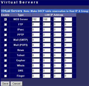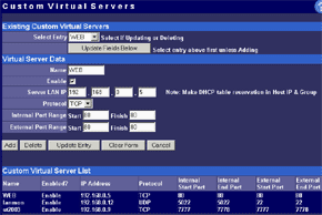 Механизм виртуальных серверов позволяет сделать видимым из Интернет сервер, находящийся за маршрутизатором (в локальной сети). В обычных условиях, ни одна из машин в локальной сети не видна из Интернет. Но в меню конфигурирования виртуальных серверов можно назначить порт (например 80 — WEB) на маршрутизаторе и адрес/порт внутри локальной сети, куда будет перебрасываться запрос. Таким образом, с точки зрения человека из Интернет, при обращении к внешнему (доступному из Интернет), адресу, он видит WEB-сервер, находяшийся на 80-м порту маршрутизатора. На самом деле, сервер находится в локальной сети за маршрутизатором, но извне этого не видно. С точки зрения WEB сервера в локальной сети, он видит обращение из Интернет и обрабатывает его стандартным образом. Для виртуальных серверов возможно задание как заранее преопределенных портов (распространненных служб), так и своих собственных. Во втором случае возможно указание диапазонов портов.