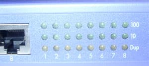 - панель индикаторов, по три на каждый порт (справа), отражающая скорость работы порта, наличие/отсутствие дуплекса, передачу данных и коллизии;