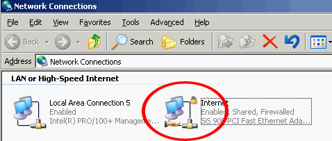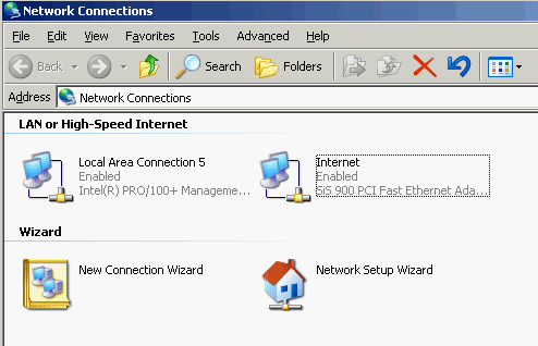 Главное, что в окне Network Connections видны два сетевых интерфейса. В данном случае (см.скришнот) левый интерфейс (Local Area Connection 5) отвечает за доступ в локальную сеть, а правый (Internet) — за доступ в глобальную сеть Интернет. Разумеется, названия интерфейсов будут отличаться в каждом конкретном случае.