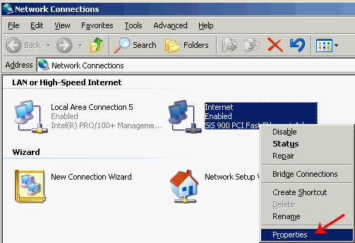 Или, если сетевое окружение (Network Places) вынесено на рабочий стол, то достаточно кликнуть по нему правой кнопкой и выбрать Properties (Свойства).