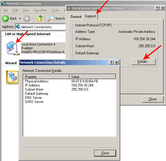 Выбрав закладку Support, можно узнать текущий IP адрес и маску подсети, назначенные сетевой карте. По умолчанию, ОС Windows дают адаптерам IP адреса их диапазона 169.254.0.0 -- 169.254.255.254 с маской подсети 255.255.0.0. Обсуждение масок, классов подсетей и так далее выходит за рамки этой статьи. Главное запомнить, что маска подсети у всех компьютеров из одной сети должна совпадать, а IP адреса — различаться. Но опять таки, цифры IP адреса, которые совпадают по позициям с ненулевыми цифрами маски подсети, у всех компьютерах должны быть одинаковыми, т.е. в данном примере у всех хостов из локальной сети в IP адресе будут совпадать две первые позиции цифр — 169.254.