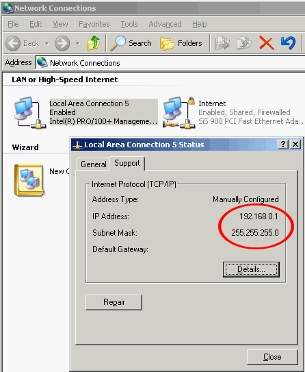 Для начала, проверим правильность установок IP-адресации у сетевой карты. По-умолчанию, ОС Windows (2K/XP) сама назначает нужные IP адреса картам, но лучше в этом убедится самим.