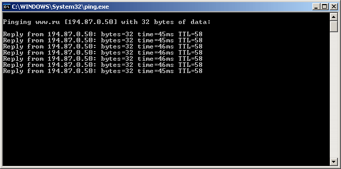 Разумеется, вместо www.ru можно выбрать любой другой работающий и отвечающий на пинги хост в Интернет. Ключ «-t» дает возможность бесконечного пинга (без него будет послано всего четыре пакета, после чего команда завершит работу, и окно с ней закроется).