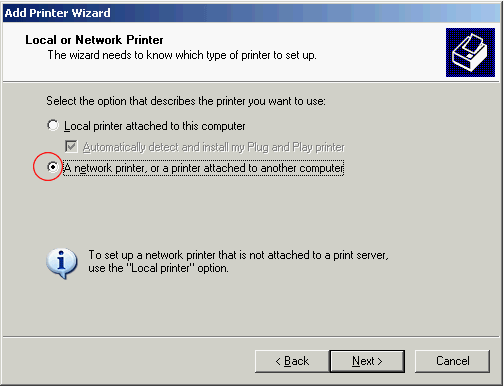 Если мы выбрали пункт поиска принтера в сетевом окружении, то после нажатия кнопки Next появится окно просмотра сетевого окружения, где и нужно выбрать расшареный принтер. После этой операции, с локальной машины можно посылать документы на печать на удаленный принтер.