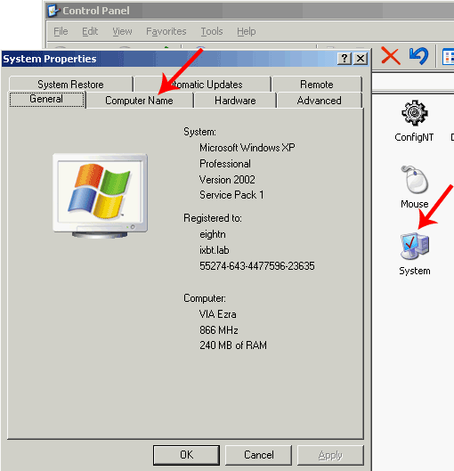 Кроме сетевых адресов, всем компьютерам нужно задать одинаковое имя рабочей группы. Это настраивается в настройках системы (System Properties). Туда можно попасть через панель управления (System —> Computer Name). Разумеется, можно задавать и разные имена рабочим группам. Это удобно, если у вас много компьютеров в сети и нужно как то логически разделить работающие машины между собой. Следствием этого станет появление нескольких рабочих групп в сетевом окружении (вместо одной).
