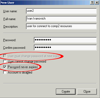 В появившемся окне вводим логин (в данном случае введен user2), полное имя и описание, последние два значения не обязательны ко вводу. Далее назначаем пароль (password), в следующем поле — повторяем тот же самый пароль. Снятие галки User must change password at next logon (пользователь должен сменить пароль при следующем входе в систему), дает пользователю входить в систему под заданным паролем и не будет требовать его смены при первом логоне. А галка напротив Password never expiries (пароль никогда не устареет), дает возможность пользоваться заданным паролем бесконечное время.