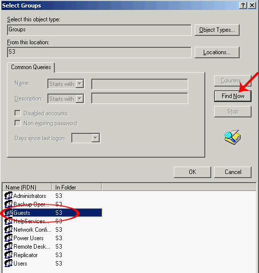 Жмем Find Now (найти). И в появившемся списке выбираем нужную группу (Guest, гости).