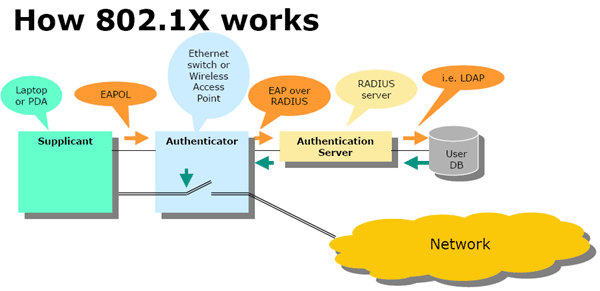 - протокол 802.1x — универсальный протокол для аутентификации, авторизации и учета (AAA)