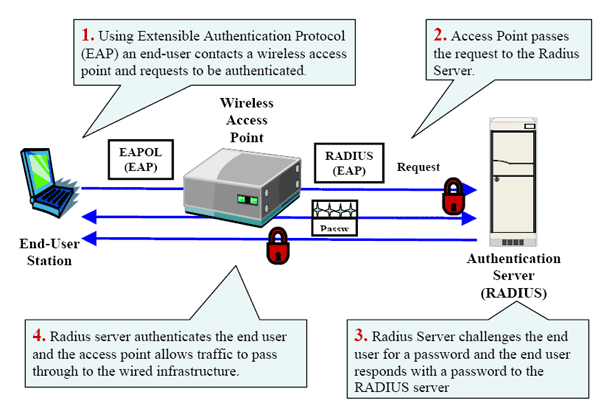 Как видно из рисунка, для коммуникации между клиентом (supplicant) и точкой доступа (authenticator) используются пакеты EAPOL. Протокол RADIUS используется для обмена информацией между аутентификатором (точкой доступа) и RADIUS-сервером (сервером аутентификации). При транзитной пересылке информации между клиентом и сервером аутентификации пакеты EAP переупаковываются из одного формата в другой на аутентификаторе.