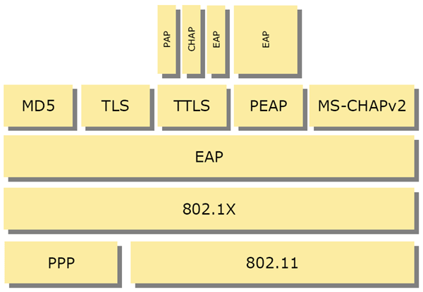 - протокол EAP — расширяемый протокол аутентификации (Extensible Authentication Protocol)