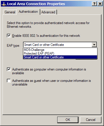 - Smart Card or Other Certificate — обычный EAP-TLS. Требует настроенной PKI, использует сертификаты для аутентификации клиентов. Более гибок (разумеется, после настройки PKI), чем аутентификация по логину/паролю. А также является единственным способом получить работающую связку беспроводных пользователей, работающих в Windows-домене.