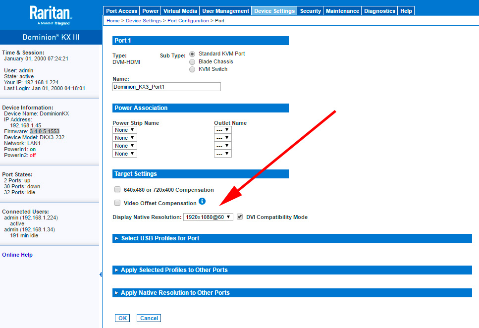 Зато в свойствах каждого порта можно указать некоторые параметры, например — максимальное разрешение видео. Здесь у нас с одним из управляемых компьютеров «на автомате» все снова не получилось: Windows 10 на клиенте, подключенном через HDMI (D2CIM-DVUSB-HDMI), упорно отказывалась выставлять разрешение выше 1280×1024 (по факту было 1920×1080). Пришлось указать максимальное разрешение для этого клиента «вручную».