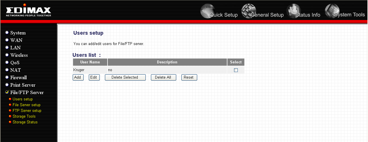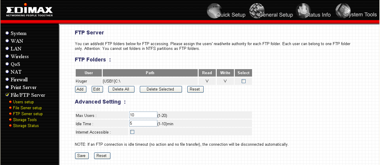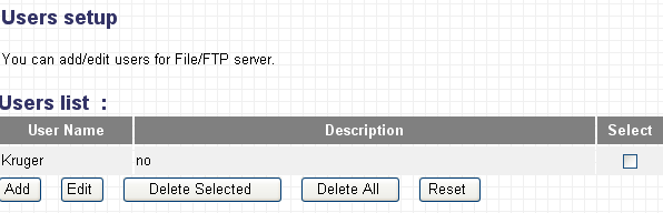Здесь реализован интерфейс добавления новых пользователей. Имена/пароли пользователей, добавленных через данный интерфейс, можно будет использовать для доступа к хранилищу файлов по SMB и FTP протоколам. Хотим отметить, что устройство не предоставляет возможности неавторизованного доступа к хранилищу — возможен только доступ с использованием логинов и паролей, которые как раз и задаются с использованием настроек, представленных на скриншоте выше.