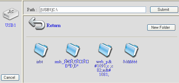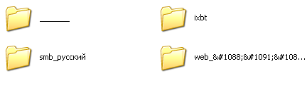 Под конец поговорим о типичных проблемах с кириллическими именами файлов и папок. Как пример, мы можем создавать директории на накопителе, получив доступ с использованием протоколов FTP и SMB. Также возможно создание директорий с использованием встроенного WEB-интерфейса. При использовании английских символов при создании директорий с использованием любого из интерфейсов — проблем не возникает, но при использовании русских символов в названии файлов и папок возникает типичная проблема с кодировками, в чем можно убедиться на скриншотах далее.