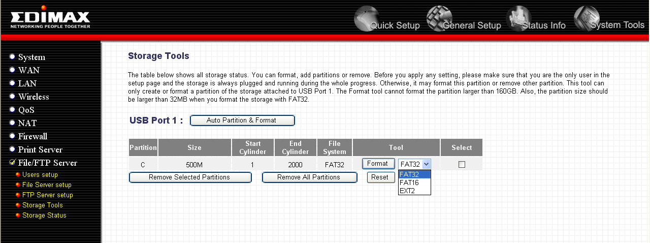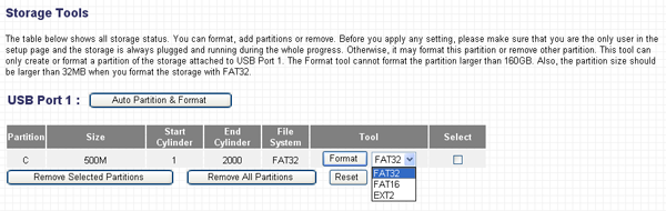 В устройстве реализована возможность создания, удаления и форматирования разделов на накопителе. Также возможно и создание разделов, но при этом нет возможности задать размер раздела. Кнопка "Auto Partition & Format" позволяет автоматически создать раздел на накопителе и отформатировать его… при этом разделение на несколько разделов возможно только, если накопители имеют емкость более 160 Гб. Возможно, провести отдельное форматирование раздела — при этом можно выбрать тип файловой системы из списка — устройство поддерживает файловые системы FAT16, FAT32 и EXT2 (стандартный тип файловой системы для ОС семейства Linux).