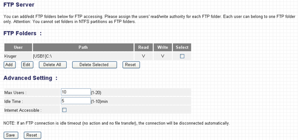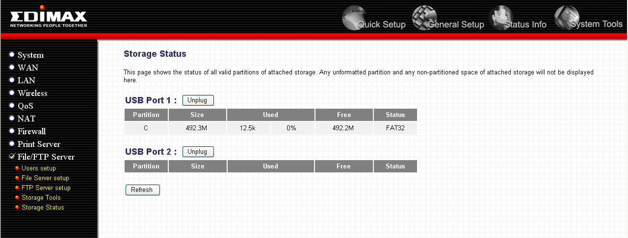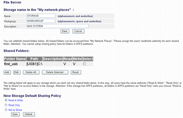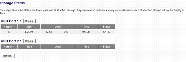 На устройстве расположены два порта USB 2.0, позволяющие подключать внешние накопители данных и USB-принтеры. USB-принтеров, к сожалению, в нашем арсенале не оказалось, зато оказался Flash-накопитель, с которым мы и попробуем поработать. Для начала посмотрим на интерфейс настройки Flash-накопителей…