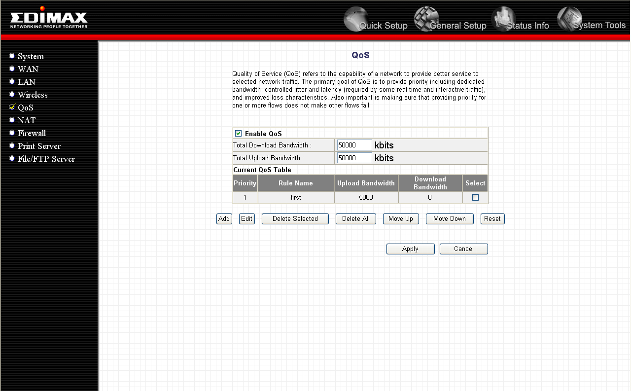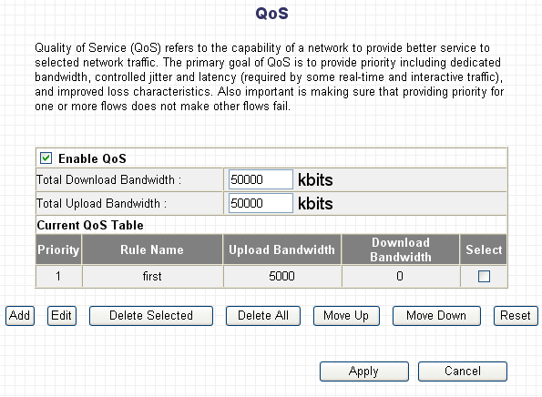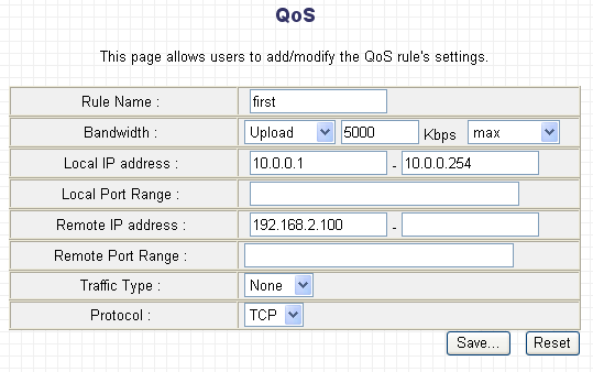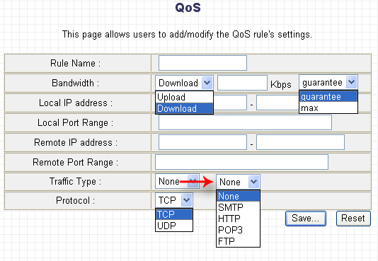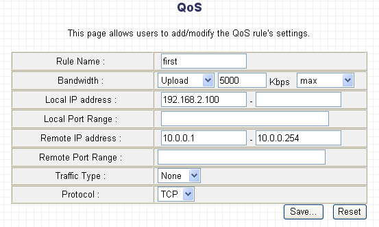 В качестве критериев шейпинга трафика можно использовать диапазон IP-адресов источника/назначения пакетов, диапазоны портов источника/назначения пакетов, протокол (TCP или UDP), а также "тип трафика" (HTTP, SMTP, POP3, FTP). После создания, для сохранения правила, нужно нажать кнопку "Save", но, как было сказано выше, правила шейпинга начнут применяться только после перезагрузки маршрутизатора.