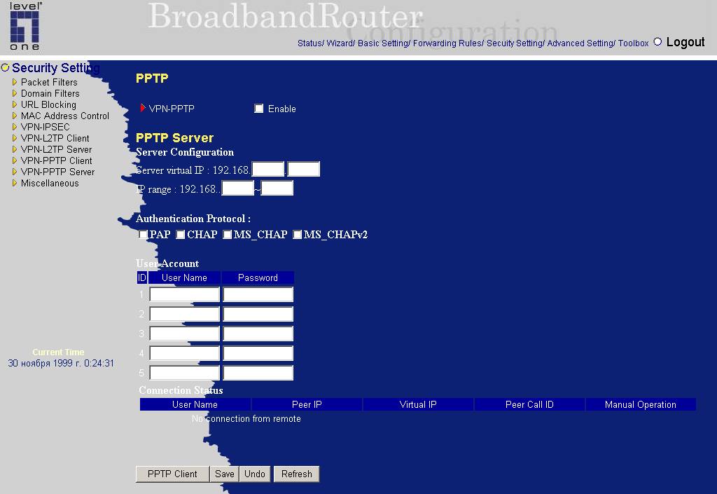 Маршрутизатор Level One FBR-1411TX включает в себя целых 3 VPN-сервера: PPTP, L2TP и IPSec. Рассмотрим их возможности по порядку.
