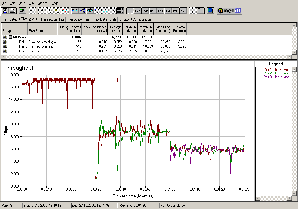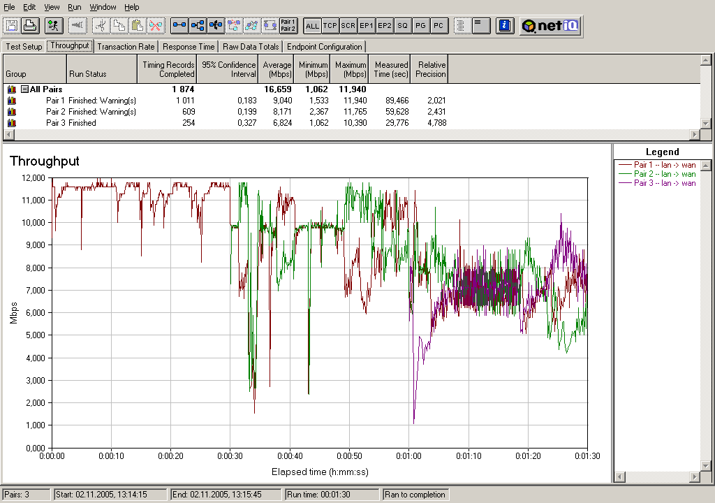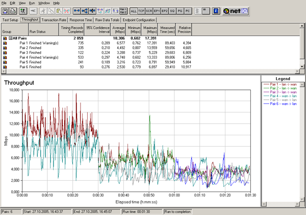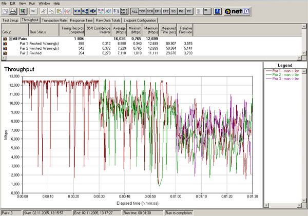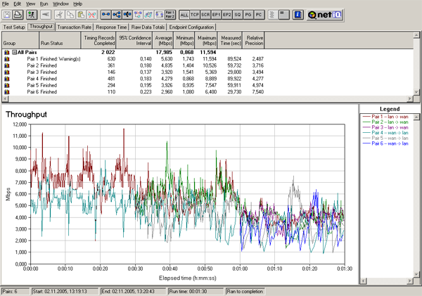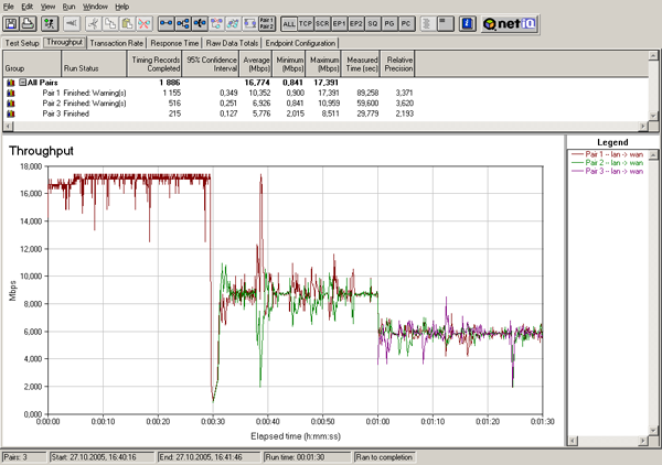 Теперь рассмотрим, как ведет себя скорость при постепенном подключении VPN-туннелей. Трафик в туннелях запускался с интервалом 30 секунд — то есть сначала запускался трафик в первом туннеле, 30 секунд спустя — во втором, еще 30 секунд спустя — в третьем. Тесты проводились для двух полудуплексных режимов (2 теста: сначала трафик гнался в одном направлении, затем в обратном) и для полнодуплексного режима.