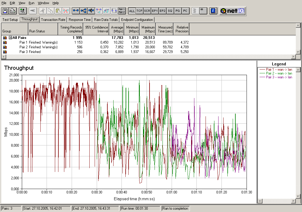 Максимальная скорость: 20,454 Мбит/с — при добавлении третьего туннеля падения скорости не происходит — IPSec VPN-сервер хорошо справляется с несколькими туннелями, хотя сложно сказать, как он себя поведет, если количество одновременно работающих туннелей будет близко к своему максимальному значению (40 туннелей).
