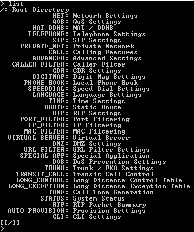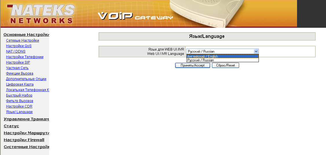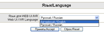 Устройство также может быть настроено с помощью IVR-интерфейса — то есть через телефон. При изменении языка WEB-интерфейса также меняется и язык голосового интерфейса. С помощью этого интерфейса управления также можно произвести настройку IP-адресов физических интерфейсов устройства. Список команд (он естественно цифровой) приводится в документации к устройству.
