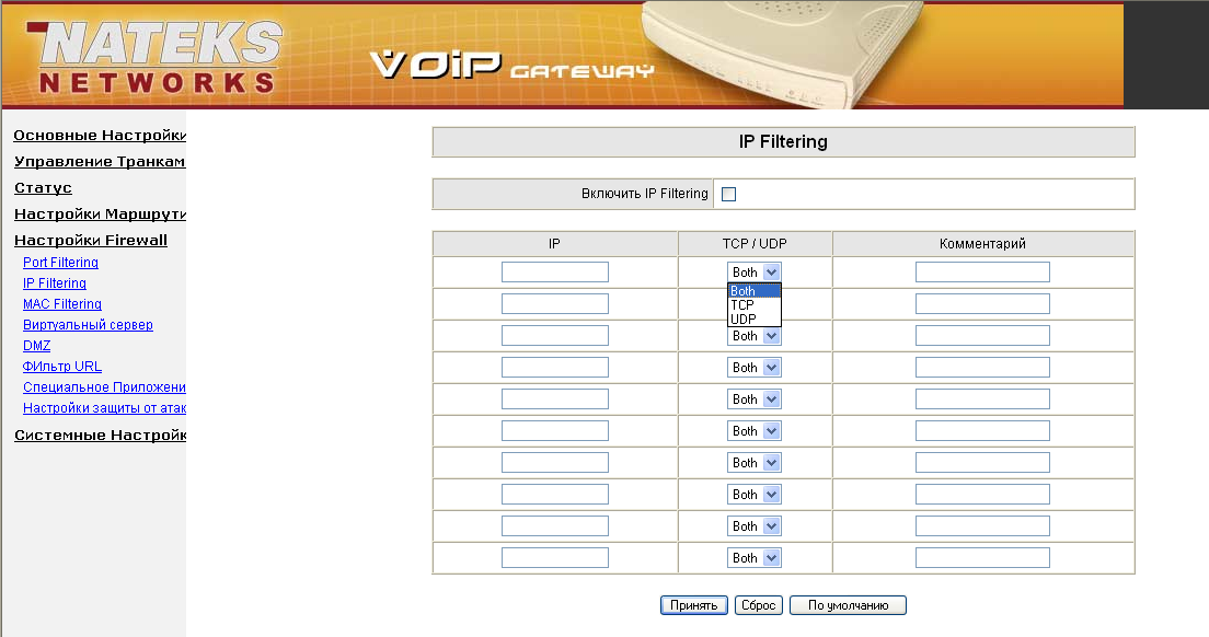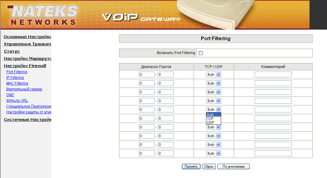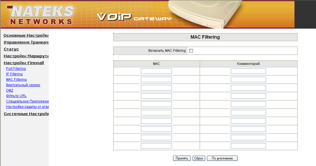 - Количество правил фильтрации ограничено 10 для фильтрации по MAC-адресу, IP-адресу, и TCP(UDP)-портам